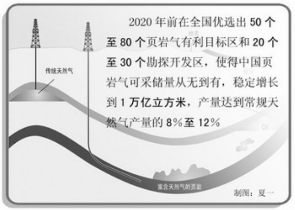 2020年前在全国优选出50个至80个页岩气有利目标区和20个至30个勘探开发区,使得中国页岩气可采储量从无到有,稳定增长到1万亿立方米,产量达到常规天然气产量的8%至12%
