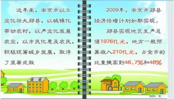 2009年,南京市郊县经济倍增计划如期实现。郊县实现地区生产总值1976亿元,地方一般预算收入210亿元,占全市的比重分别由“十一五”初期的35.2%和29.9%提高到46.7%和48%,接近全市一半左右。一、二、三产业结构发生新变化,2009年郊县三大产业结构为4.8:64.1:31.1。高效农业规模化不断推进。2009年,全市高效农业和渔业面积154万亩,占种养面积的三分之一左右,其中设施农业面积超过32万亩。基础设施逐步完善,实现了县县通高速公路、村村通水泥路。郊县城镇化率超过67%,比2005年提高6个百分点。农村保障体制发生新变化。新型农村养老保险参保人数达到119.5万人,基本实现全覆盖;新型农村合作医疗参保人数达到195万人,基本实现应保尽保。