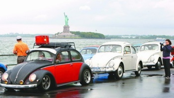 8月22日,在美国纽约总督岛,展出的老爷车吸引行人驻足观看。 当日,70多辆大众汽车公司于20世纪50年代至70年代生产的经典老爷车相聚在总督岛,让游客和车迷们大饱眼福。 新华社记者 刘 欣摄
