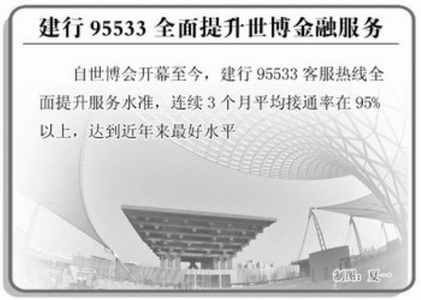 本报讯 为确保世博会期间95533热线的接通率,建行上海市分行95533客户服务中心通过与总行多次协调,在保证客户选择业务进线后由专业技能组优先接听的同时,保证5秒钟后客户电话能及时被客服人员接听,达到接通率98%历史最高水平。 (罗玉婷)
