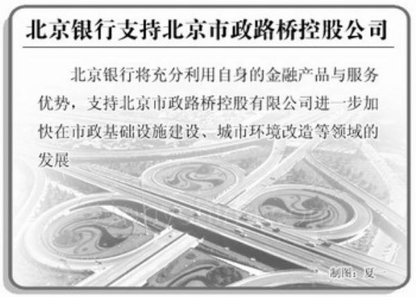 本报讯 记者刘畅报道:北京银行日前与北京市政路桥控股有限公司在北京银行大厦签署全面战略合作协议。根据协议,北京银行将向该公司提供意向性授信80亿元。北京银行表示将充分发挥自身优势,整合金融服务资源,为北京市政路桥控股有限公司提供一揽子的金融服务。