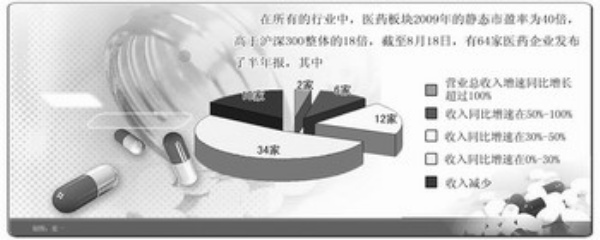 统计显示,截至8月18日,有64家医药企业发布了半年报,营业总收入增速同比增长超过100%有华兰生物和海普瑞两家,收入同比增速在50%—100%有6家,30%—50%的有12家,0%—30%的有34家,收入减少的有10家。归属母公司净利润同比增速超过100%有10家,50%—100%的有6家,30%—50%的有20家,0%—30%的有16家,增速为负的有12家。总体来看,半年报的业绩还是不错的,没有预期中的价格管理办法带来的企业业绩大幅下降,也缓解了医药板块的高估值。