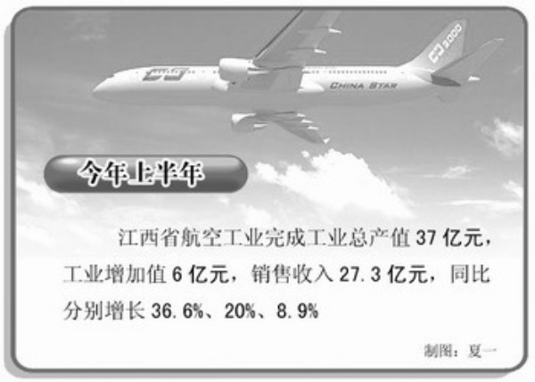 江西省航空工业有着坚实的基础。56年前,新中国第一架飞机在南昌飞向蓝天。经过几十年的不懈努力,江西已成为国家重要航空产业研发和生产基地,江西省内有洪都航空工业集团、昌河飞机工业集团两个航空工业大型骨干企业和一个中外合资民营航空企业————九江红鹰飞机制造有限公司,还拥有650飞机设计所、602直升机设计所及南昌航空大学等科研院所和试验基地。江西省委、省政府高度重视航空制造业,把航空产业作为战略性支柱产业重点发展。今年上半年,江西省航空工业完成工业总产值37亿元,工业增加值6亿元,销售收入27.3亿元,同比分别增长36.6%、20%、8.9%。
