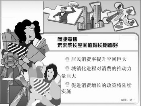 商业零售未来成长空间值得长期看好。第一、居民消费率提升空间巨大。目前我国居民消费率仅为35%,属于较低水平,发展空间巨大;第二、城镇化进程对消费的推动力量巨大。目前的城镇化率为45.7%,并且保持在每年提升一个百分点的速度;目前来看,城镇化进程成为提升社会总体消费能力的重要因素;第三、促进消费增长的政策将陆续实施。政府正在实施的医疗体制和社会保障制度改革,以及可能推出的居民收入分配改革方案都将对未来的消费增长形成长期利好。