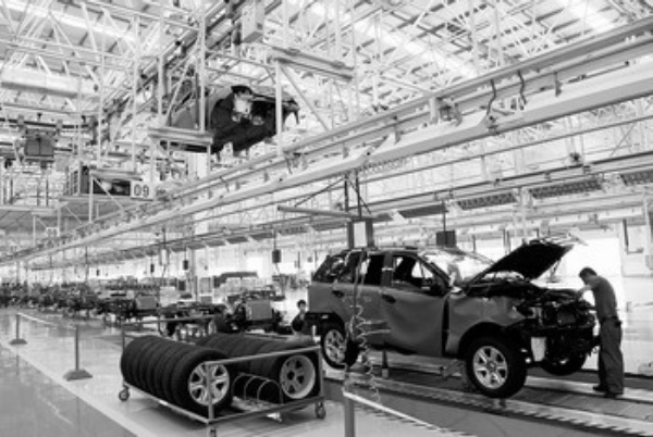 工人在丹东曙光新旗胜CUV汽车生产线上忙碌(8月30日摄)。2010年上半年,丹东曙光汽车集团销售SUV、皮卡超过1.7万辆,同比增长92.32%。 王永臣摄(新华社发)