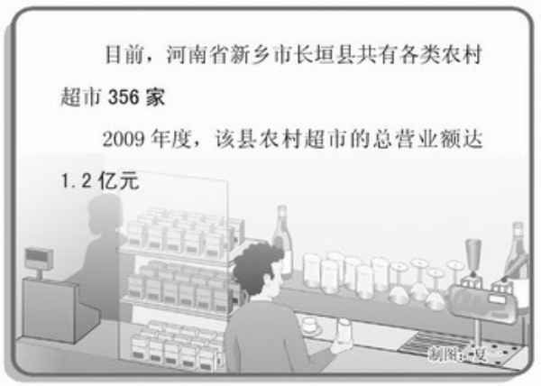 目前,长垣县有各类农村超市共计356家,2009年,该县农村超市的总营业额达1.2亿元。