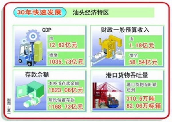 30年快速发展,汕头经济特区的GDP由12.62亿元增至1035.73亿元;财政一般预算收入由1.18亿元增至58.54亿元;本外币存款余额和居民储蓄存款分别达1623.06亿元和1168.73亿元。港口货物吞吐量达到310.6万吨、82.06万标箱。