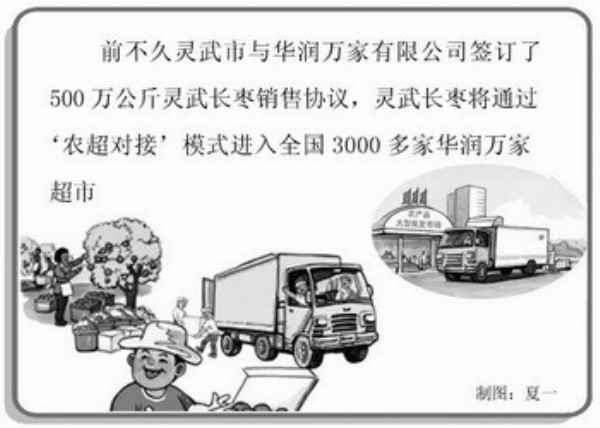 “好酒也怕巷子深!我们与华润万家对接出于两点考虑。”灵武市市长陈淑慧说,“一是如何将长枣这样的好东西卖出好价钱,二是占领高端市场如何实现规模销售。‘农超对接’让我们实现一举两得!”目前,灵武市已按华润万家公司要求建成了一条贯穿市境南北百公里长的经济林绿色长廊,精心打造东塔镇马场湖、临河镇红柳湾、狼皮子梁、大泉林场、灵武园艺场5个千亩以上的国家标准化长枣生产基地和10个百亩精品示范园区;今年完成了1500亩灵武长枣的抚育管护;完成大规格长枣育苗2100亩,完成嫁接苗木400万株,播种酸枣2300亩;建成年贮藏量5000吨气调冷藏库、年产1万吨枣汁生产线;今年将继续加大宣传力度,实现灵武长枣外包装统一,形成了灵武长枣质量与品牌防伪系统。