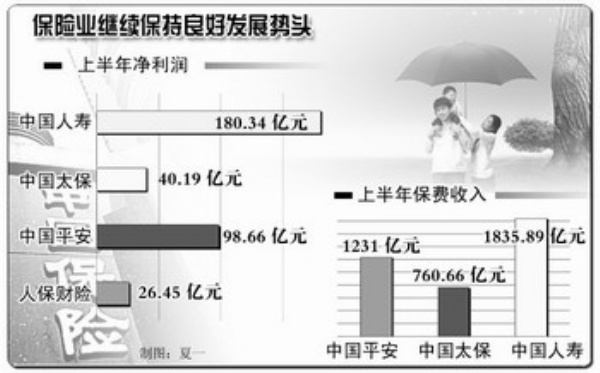 近日,中国人寿、中国平安、中国太保、人保财险等保险公司2010年半年报陆续公布。纵观几大保险公司今年上半年的经营活动,我国保险业冷静面对经营过程中的困难和问题,围绕可持续价值增长的目标,坚持转变发展方式,优化业务结构,实施稳健的投资策略,有效防范风险,加快提升营运支持能力,继续保持良好的发展态势。