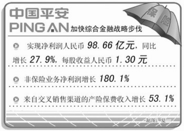 2010年上半年,中国平安集团按照既定的发展规划,继续保持了保险、银行和投资三大业务的快速健康发展,实现了均衡强劲增长。同时中国平安取得了战略投资深发展的重大突破,并积极推进平安银行与深发展的整合,为加快综合金融战略的实施奠定坚实基础。截至2010年6月30日止6个月期间,中国平安实现净利润人民币98.66亿元,每股收益人民币1.30元(2009年同期:人民币1.02元),非保险业务净利润增长180.1%。