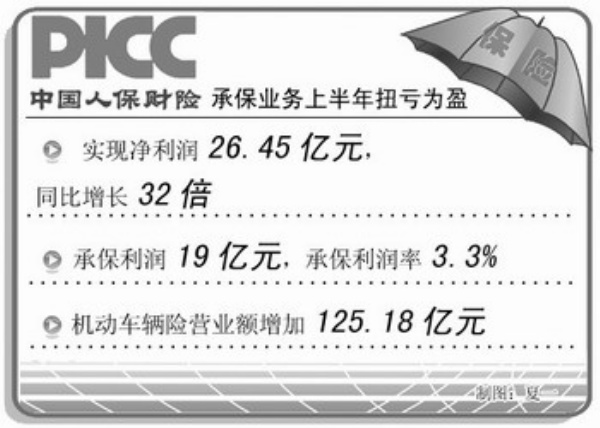 半年报显示,人保财险上半年实现净利润26.45亿元,同比增长32倍,同时,作为公司核心业务的承保业务在上半年成功地扭亏为盈,盈利19亿元,承保利润率达到3.3%。
