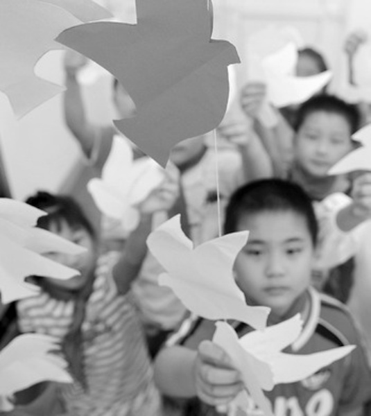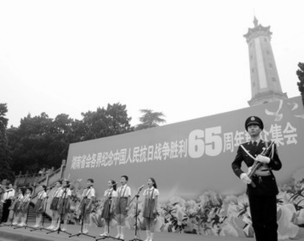左图 9月3日,合肥市南七街道丽景小学,学生们通过观看抗战图片、折和平鸽,祝愿世界和平。 新华社记者 刘军喜摄 下图 9月3日,为纪念抗战胜利65周年,南京各界在南京抗日航空烈士纪念碑前举行纪念活动。 新华社记者 孙 参摄