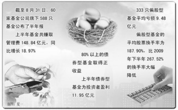 截至8月31日,60家基金公司旗下588只基金公布了半年报。从业绩上看,上半年偏股型基金表现欠佳。据好买基金研究中心统计,纳入统计的333只偏股型基金平均亏损9.48亿元,只有嘉实主题精选盈利5.18亿元。其中,规模较大的基金亏损金额较大,如中邮核心成长,截至今年二季度末资产管理规模达193.91亿元,上半年净值下跌27.84%,净亏损75.37亿元,居所有偏股型基金之首。而得益于上半年债市的稳定上涨,80%以上的债券型基金取得正收益。其中,工银瑞信信用添利A上半年净利润1.75亿元,是惟一一只获利超过亿元的债券型基金,华夏债券AB、工银瑞信增强收益A的利润也在8000万元以上。整体上,上半年债券型基金为投资者盈利11.95亿元。