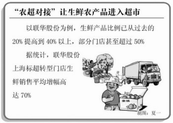 农超对接不是简单地将农产品直接引进超市,还有一系列与之相配套的工作要做,比如产地农副产品的标准化管理、物流配送与品质保障体系建设、产地采购与门店销售的价格策略、商品陈列与市场推广等诸多方面需要建立和完善。接下来,联华股份将充分利用自身实体网络和信息管理等现代商业优势,优化生鲜食品产业链建设,进一步做好农超对接工作,将商业现代化推进农业产业化的发展工作落到实处。