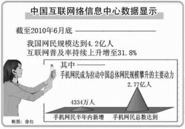 数据也证明了这一点。根据《第26次中国互联网络发展状况统计报告》统计显示,截至今年6月,我国手机网民数已达2.77亿,较2009年底增长率为22%,较传统互联网网民增幅更大。创新工场董事长李开复直言,中国移动互联网用户数量在未来5年将增长超过1倍以上,达到8亿左右。