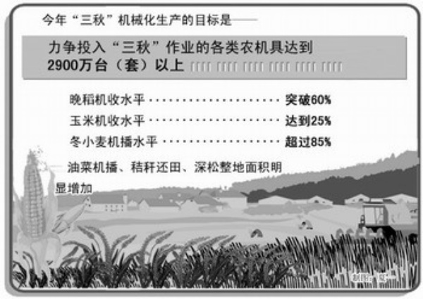 这位负责人介绍说,今年“三秋”机械化生产的目标是,各地要以玉米机收、水稻机收、小麦机械化免耕播种、油菜机播、机械化秸秆粉碎还田、机械深松整地为重点,全力以赴组织农业机械投入“三秋”作业,全面提高重点作物、关键环节和主产区的农机作业水平;力争全国投入“三秋”作业的各类农机具达到2900万台(套)以上,晚稻机收水平突破60%,玉米机收水平同比提高8个百分点,达到25%。冬小麦机播水平超过85%,油菜机播、秸秆还田、深松整地面积明显增加。