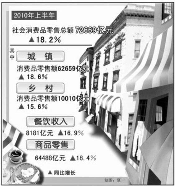 今年以来,随着扩大消费的一系列政策效应进一步显现,现代零售渠道不断向纵深扩展,国内市场繁荣活跃,消费市场呈现平稳较快增长态势,商业零售业的规模和利润率不断提高。上半年社会消费品零售总额72669亿元,同比增长18.2%。按经营单位所在地分,城镇消费品零售额62659亿元,增长18.6%;乡村消费品零售额10010亿元,增长15.6%。按消费形态分,餐饮收入8181亿元,增长16.9%;商品零售64488亿元,增长18.4%。