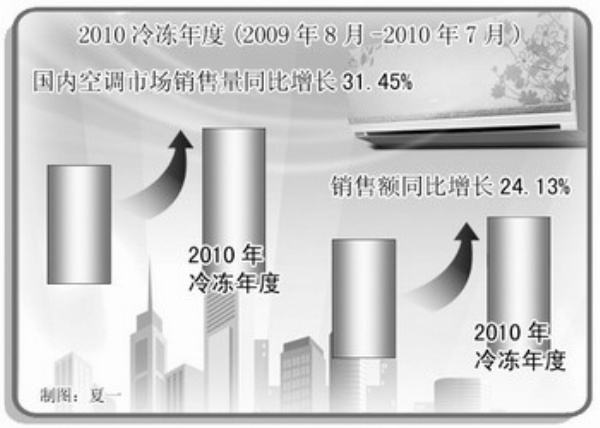 8月24日,在“2010—2011中国空调行业高峰论坛”上,国家信息中心信息资源开发部联合中国家电网发布的《2010冷冻年度空调市场白皮书》(简称“白皮书”)显示,2010冷冻年度(2009年8月—2010年7月)国内空调市场销售量同比增长31.45%,销售额同比增长24.13%,尽管销售额增幅仍低于销售量增幅,但已经结束了自2008冷年以来国内市场整体销售规模逐年下滑的局面,迎来了难得的增长契机。
