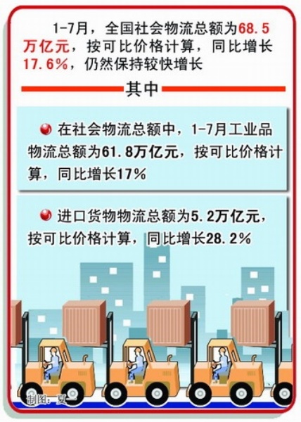 一是社会物流总额增幅继续回落。1至7月,全国社会物流总额为68.5万亿元,按可比价格计算,同比增长17.6%,在保持较快增长的基础上,延续了今年以来的趋缓态势,增幅比上半年(1至6月)回落了0.8个百分点。在社会物流总额中,1至7月工业品物流总额为61.8万亿元,按可比价格计算,同比增长17%,增幅比上半年回落0.6个百分点;进口货物物流总额为5.2万亿元,按可比价格计算,同比增长28.2%,增幅比上半年回落2.9个百分点。