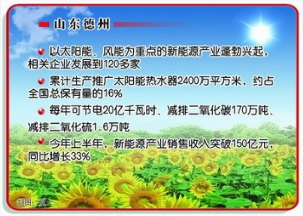 近年来,德州以太阳能、风能为重点的新能源产业蓬勃兴起,相关企业发展到120多家,累计生产推广太阳能热水器2400万平方米,约占全国总保有量的16%,每年可节电20亿千瓦时、减排二氧化碳170万吨、减排二氧化硫1.6万吨。今年上半年,德州新能源产业销售收入突破150亿元,同比增长33%。
