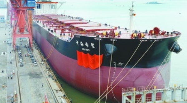 9月12日,由广州中船龙穴造船有限公司建造的23万载重吨矿砂船“中海希望”轮交付使用。该船全长325米、宽52.5米,是我国自行设计、建造并拥有自主知识产权的船舶产品,可运载矿砂煤炭。 新华社记者 卢汉欣摄