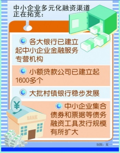 中小企业金融服务的多层次金融组织体系正在建立,中小企业多元化融资渠道正在拓宽。各大银行已建立起中小企业金融服务专营机构,小额贷款公司已建立起1600多个,大批村镇银行稳步发展。中小企业集合债券和集合票据等债务融资工具,发行规模也有所扩大。