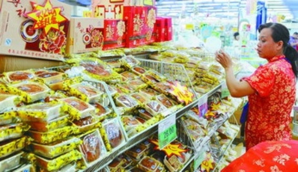 9月13日,工作人员在青岛一超市内布置月饼专柜。散装月饼多为简单大方的盒装或彩色塑料装。 随着中秋临近,月饼大量上市。记者在岛城部分商场超市内见到,许多摈弃豪华包装,售价几元到几十元不等的“瘦身月饼”成为今年中秋市场的主角。 新华社记者 李紫恒摄