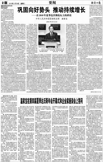 温家宝在第四届夏季达沃斯年会开幕式和企业家座谈会上答问