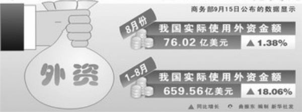 本报北京9月15日讯 记者李予阳报道:商务部新闻发言人姚坚在今天举行的发布会上介绍,8月份我国实际使用外资76.02亿美元,同比增长1.38%。前8个月,累计吸收外资659.56亿美元,同比增长18.06%。