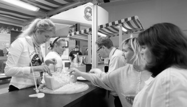 9月14日,参观者在俄罗斯莫斯科国际食品和饮料展览会上品尝奶酪。当日,为期4天的2010国际食品和饮料展览会在莫斯科开幕,来自俄罗斯、中国等50多个国家的1200余家公司参展。 新华社记者 鲁金博摄