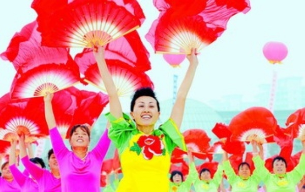 9月16日,在天津市武清区文化公园,当地群众跳起扇舞,迎接即将来临的中秋、国庆佳节。 新华社记者 马 平摄