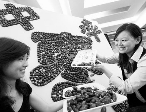 9月17日,北京丰台区长辛店镇,工作人员将大枣摆成汉字造型。当天,该镇举办一年一度的大枣评比大赛及名优品种展示活动。据介绍,该镇近年来通过建采摘园、引进新品种等手段,使得大枣产量和种植面积逐年递增,目前年产量已达20万公斤,年产值超过300万元。 本报记者 赵 晶摄