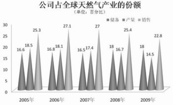 一是发展主营产业,打造能源龙头企业。俄罗斯天然气公司以天然气为主业,抓住天然气勘探、开采、运输、储存、加工、销售和出口各个环节,扩大经营,夯实雄厚的实力基础,成为世界级大型天然气公司。2009年公司的资源基地进一步扩大,公司成为世界上最大的天然气储量的拥有者,总计达到33.6万亿立方米,相当于俄罗斯天然气总探明储量的70%,占世界总储量的五分之一。公司已经连续5年保持了天然气储量增长。