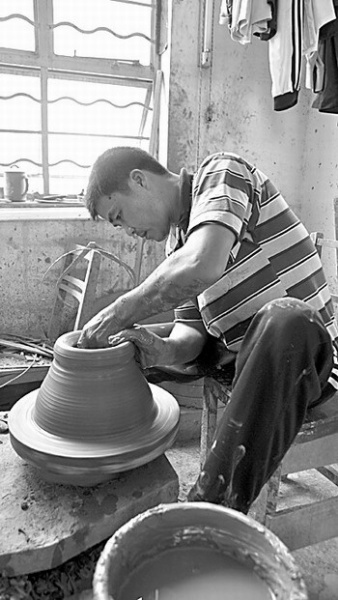 广西工艺美术大师陆景平告诉记者,这位工人正在做的这道工序叫“拉坯”。它是现在坭兴陶制作工艺中最传统、技术难度最高的一道工序。