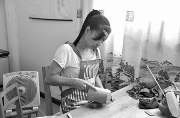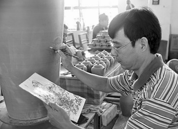 穿过陶坯制作区便来到坭兴陶艺术加工区。一位穿着朴素,颔下留着一撮浓密胡子的老人吸引了记者的目光。老人左手捧着一个陶坯,右手拿着雕刻刀,全神贯注地在陶坯上雕刻着,一幅古墨山水画已经隐约可见。对于记者的到来,老人似乎浑然不觉。