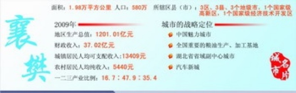 襄樊古称襄阳,汉江穿城而过,倒映着古老的城墙。在这座建城2800多年的全国历史文化名城,蓬勃发展的高新技术产业正在成为最新的风景。目前,襄樊全市拥有高新技术企业236家,2009年实现工业增加值184.7亿元,同比增长33.8%,占全市规模以上工业增加值总量的40%,占全省高新技术产业增加值总量的16.2%,仅次于武汉市居湖北省第二位。
