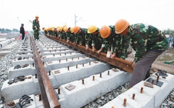 9月27日,在宝成铁路石亭江大桥工地,建设者在架桥机经过的线路上进行人工铺轨。 当日,宝成铁路石亭江大桥水害重建工程开始架梁施工,预计9月30日完成全部架梁工作。8月19日,宝成铁路石亭江大桥下行线因受到洪水冲击,部分桥墩垮塌。事故发生后,宝成铁路石亭江大桥的抢险重建工作立即展开。 张长明摄 (新华社发)