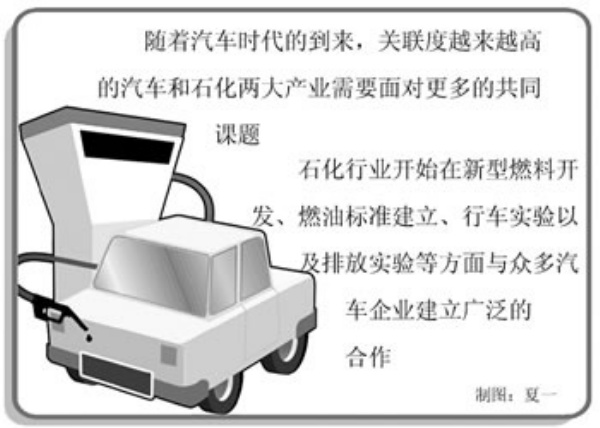 随着汽车时代的到来,关联度越来越高的两大产业需要面对越来越多的共同课题,其中涉及燃油、化工、橡胶等专业加工技术及机动车节能减排等诸多方面。石化行业开始在新型燃料的开发,燃油标准建立,燃料检测服务,行车实验以及排放实验等方面与众多汽车企业建立广泛的合作。