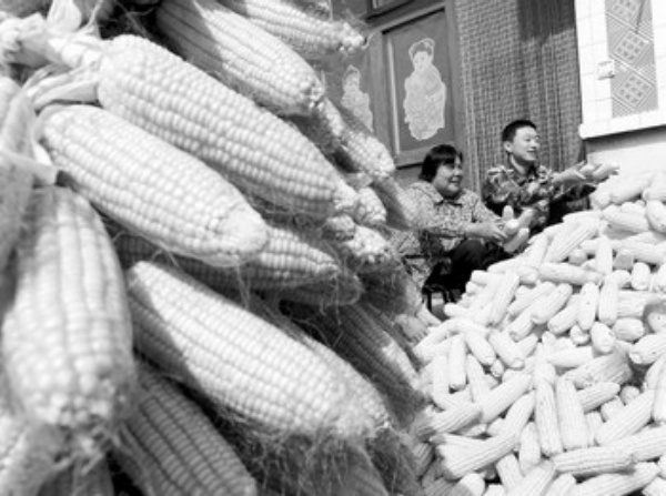 9月28日,石家庄边防检查站的战士在帮助驻地新城铺村的葛小妮(左)老人晾晒玉米。日前,河北省的玉米等秋粮作物相继成熟,农民开始实施收获。据农业部门介绍,河北省今年秋粮收获面积5720万亩,预计秋粮总产达1782万吨。 新华社记者 杨世尧摄