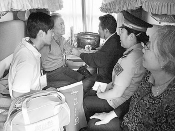 日前,郑州铁路局为河南路仕达旅行社组织的千人夕阳红旅行团开行了安阳—乌鲁木齐—银川西北旅游专列。 图为旅游专列列车长和随车医生正在探视生病的旅客。 吕群富摄