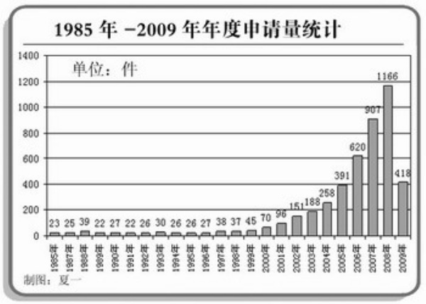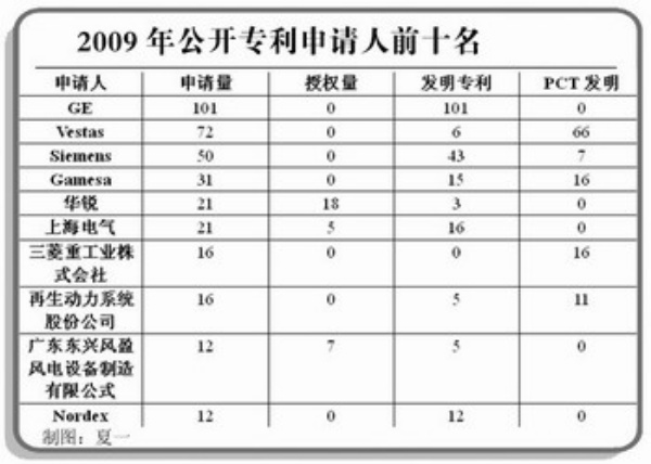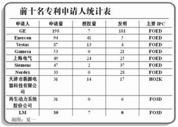 本栏数据摘自风能信息中心《中国风电专利综述2010》,该报告专利数据来自国家知识产权局及世界知识产权组织专利数据库中定期发布更新的专利数据。采集年限为1985年—2009年12月31日。数据中既包括中国专利申请人所申请专利,也包括外国申请人在中国或通过专利的国际申请进入到中国的专利数据。