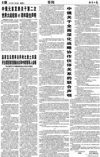 中俄关于全面深化战略协作伙伴关系的联合声明