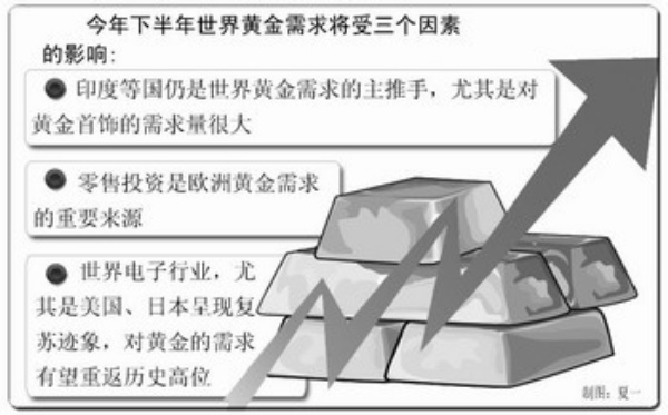 该报告预测,今年下半年世界黄金需求将受以下三个因素的影响:一是印度等国仍是世界黄金需求的主推手,尤其是对黄金首饰的需求量很大;二是零售投资是欧洲黄金需求的重要来源;三是世界电子行业,尤其是美国和日本都呈现复苏迹象,对黄金的需求有望重返历史高位。