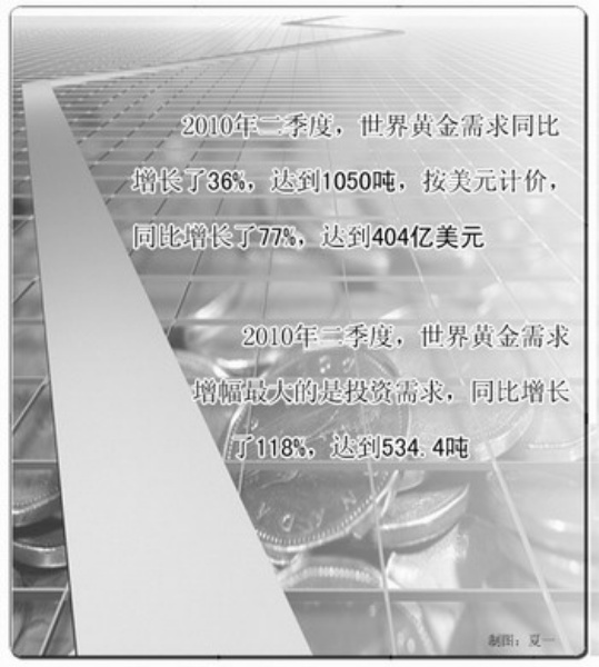 位于伦敦的世界黄金理事会预测,今年世界黄金需求将保持旺盛势头,主要原因有两点:一是印度等国黄金需求量持续攀升;二是部分国家公共债务猛增及全球经济复苏前景的不确定性,推高了全球黄金投资需求。该报告显示,今年第二季度世界黄金需求同比增长了36%,达到1050吨,按美元计价同比增长了77%,达到404亿美元。今年第二季度世界黄金需求增幅最大的是投资需求,同比增长了118%,达到534.4吨。