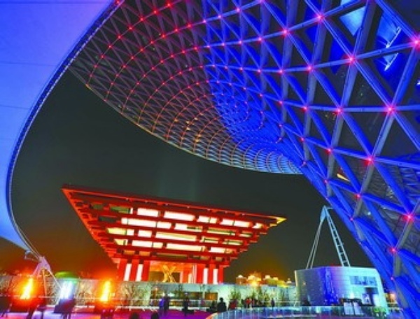 夜色中的中国馆灯光璀璨。