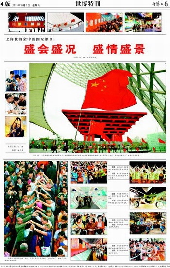 10月1日,上海世博会迎来中国国家馆日,园区内飘扬的五星红旗与中国国家馆相互辉映。中国国家馆以庄严、华美的形象吸引了四面八方的游客。