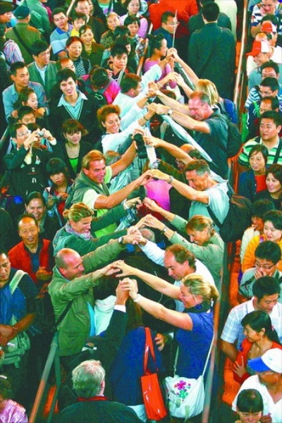 图1 等候入馆的游客排起了长队,中外游客用手臂架起了“热情通道”,蜿蜒的长龙就像友谊的桥梁。