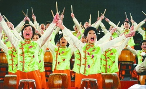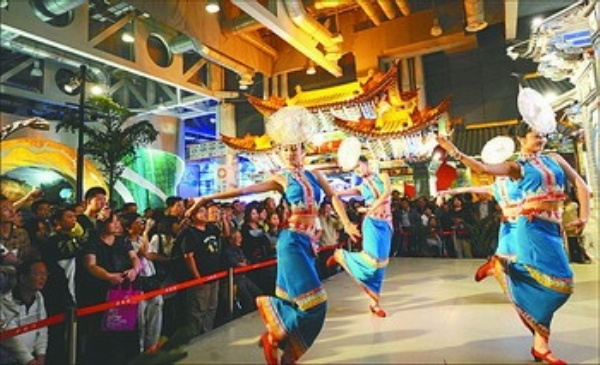 图3 演员在中国国家馆等候区表演热情奔放的“鼓舞”。