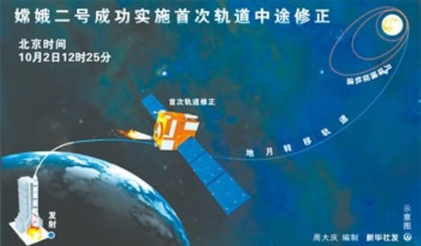 北京航天飞行控制中心副主任麻永平说,由于受入轨偏差、万有引力、宇宙环境等因素影响,嫦娥二号在38万公里的奔月旅程中,需要择机实施轨道中途修正,校正航向,才能顺利抵达环月轨道。通过认真计算、复核,北京飞控中心研究确定了嫦娥二号第一次中途修正控制策略,成功向卫星注入控制参数,启动星上490N发动机,顺利实施了首次中途轨道修正,同时也验证了卫星推力系统工作正常,为嫦娥二号顺利到达近月点奠定了坚实基础。