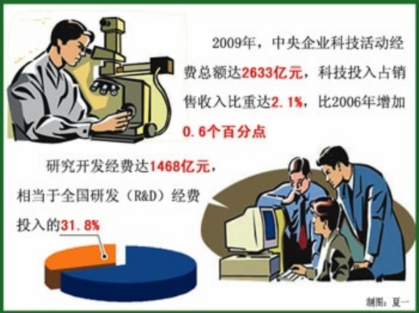 广大国有企业从研发资金保障、科研基础条件平台建设和科技人才队伍建设等方面加大投入力度,增强研发能力,勇做自主创新的主力军。以中央企业为例,2009年中央企业科技活动经费总额达到2633亿元,2006年—2009年年均增长28.5%,远高于同期销售收入和利润增幅,科技投入占销售收入比重达到2.1%,比2006年增加了0.6个百分点;研究开发经费达到1468亿元,2006年—2009年年均增长27.9%,占中央企业科技活动经费总额的55.7%,相当于全国研发经费投入的31.8%。中航工业、航天科技等7家企业科技投入总量均超过上百亿元。